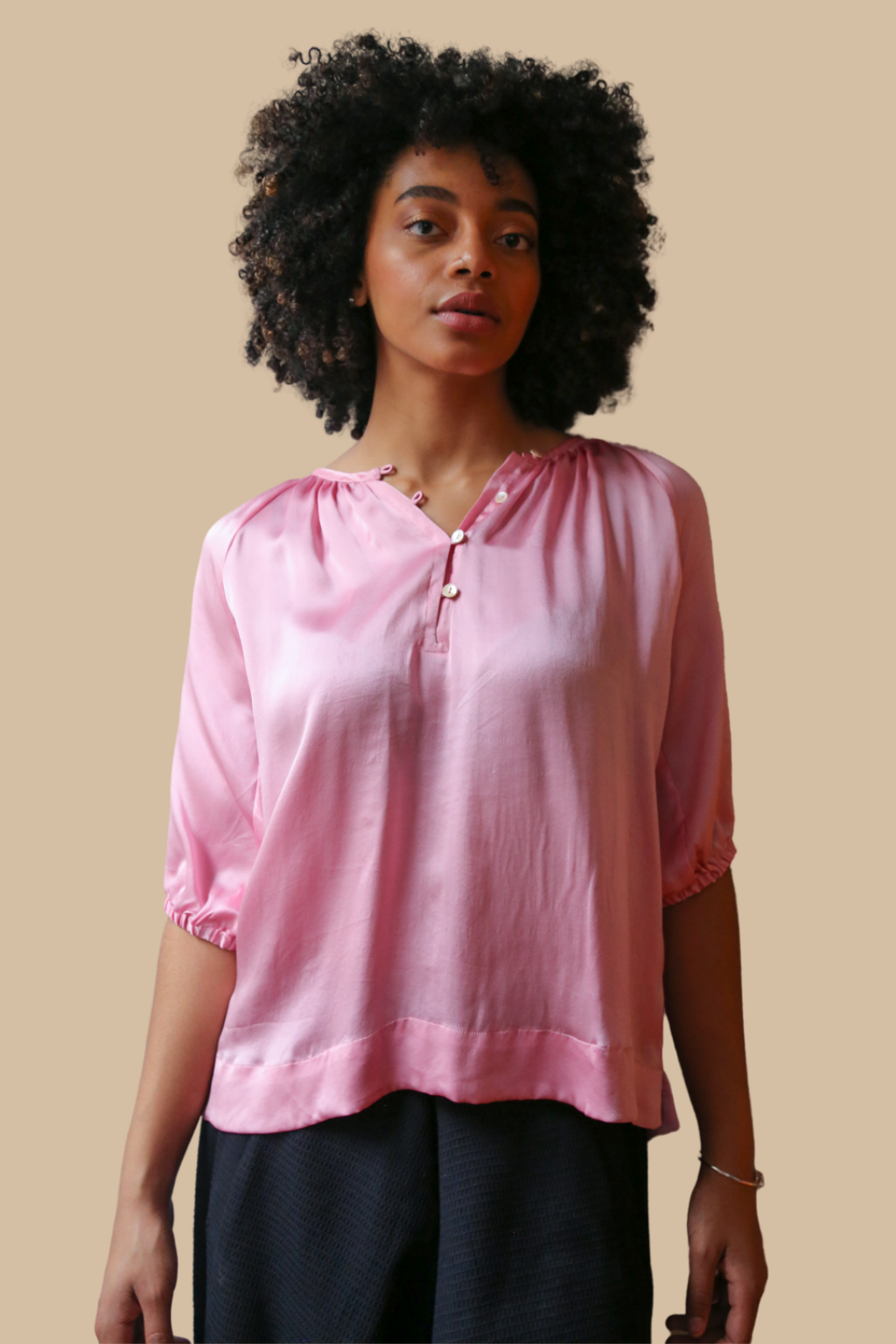 Our lightweight Circe Blouse is a silky staple style. Each piece is cut and sewn by a woman owned factory in Bangalore.
