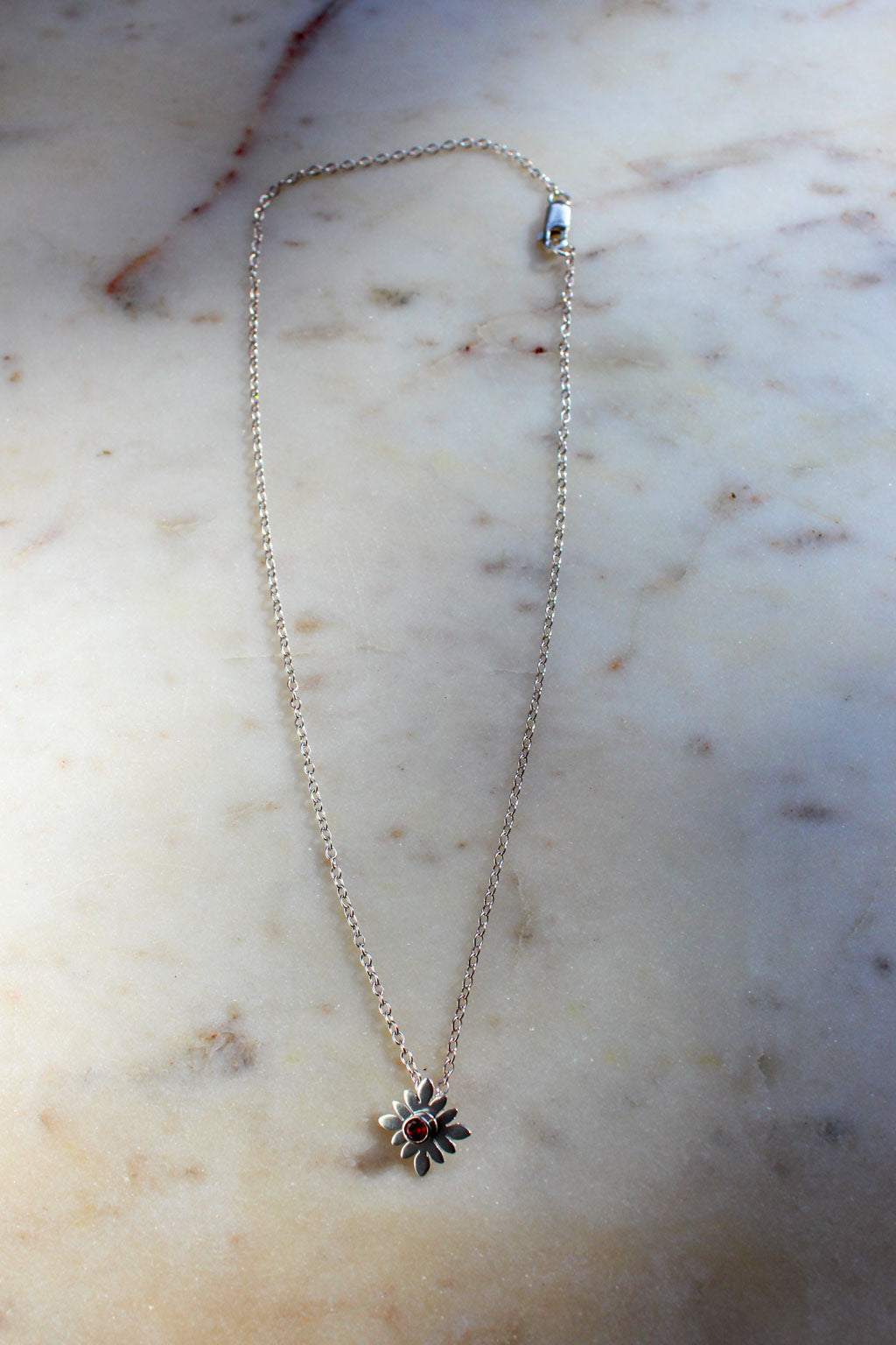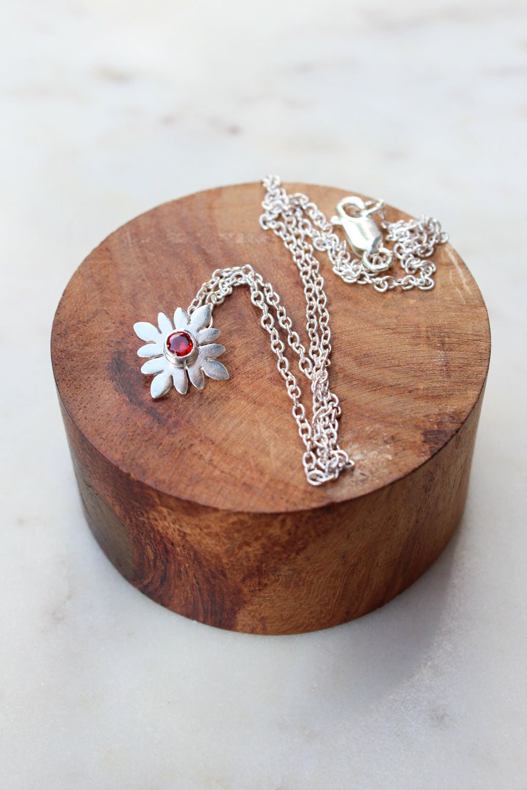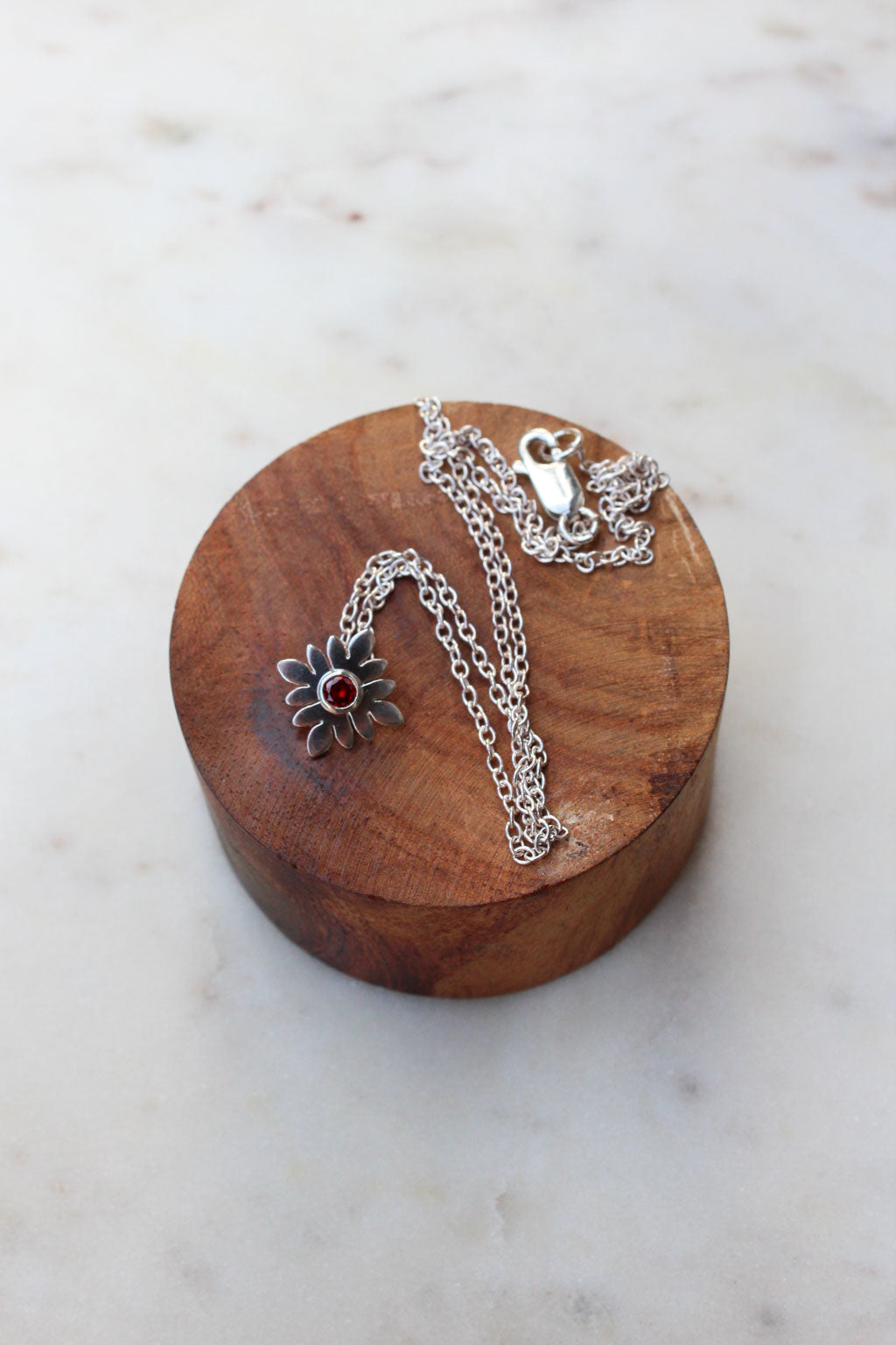 This handmade sterling silver necklace with a silver and bezel set garnet is perfect for everyday wear. This piece sits just above the clavicle and is great for layering with longer styles.